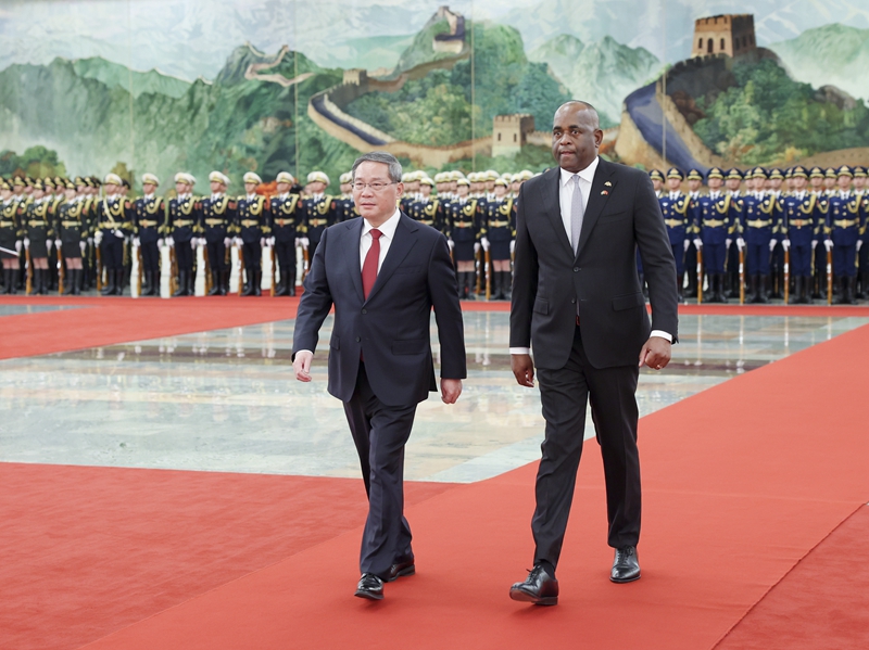 3月25日上午,国务院总理李强在北京人民大会堂同来华进行正式访问的多米尼克总理斯凯里特举行会谈。这是会谈前,李强在人民大会堂北大厅为斯凯里特举行欢迎仪式。新华社记者 丁海涛 摄