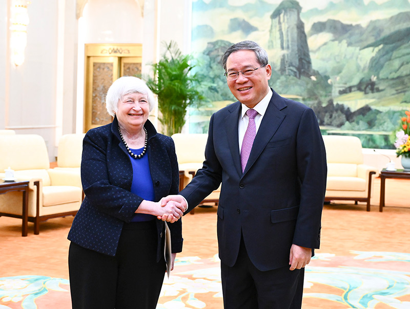 4月7日上午,国务院总理李强在北京人民大会堂会见美国财政部长耶伦。新华社记者 燕雁 摄