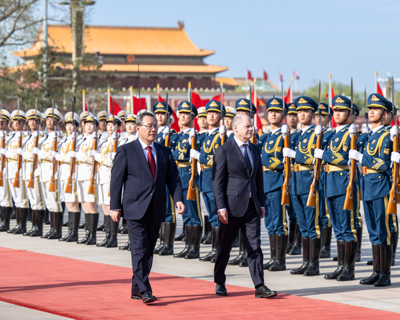 4月16日下午,国务院总理李强在北京人民大会堂同来华进行正式访问的德国总理朔尔茨举行会谈。会谈前,李强在人民大会堂东门外广场为朔尔茨举行欢迎仪式。新华社记者 翟健岚 摄