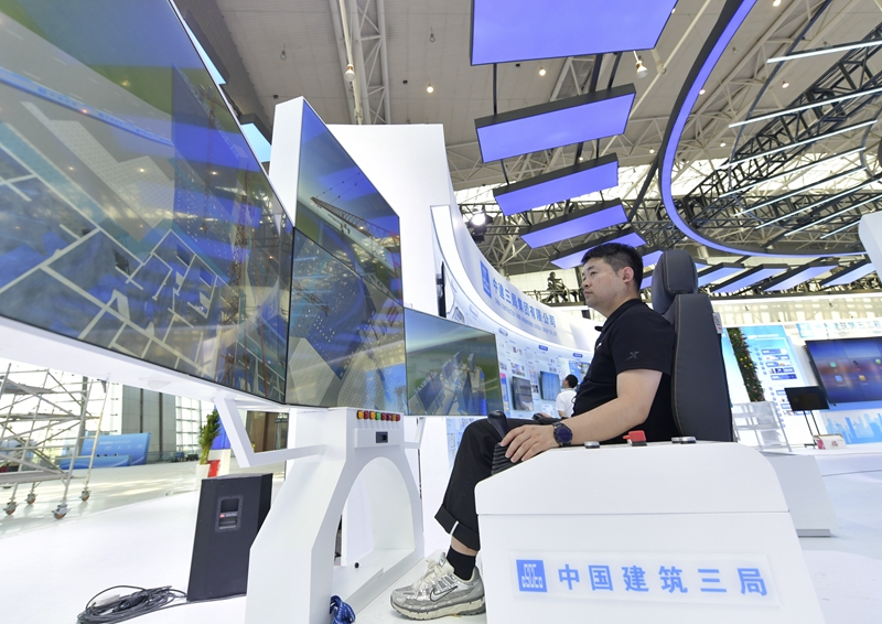 6月25日,参展商在中建三局展位调试5G塔机模拟驾驶舱。新华社记者 王菲 摄