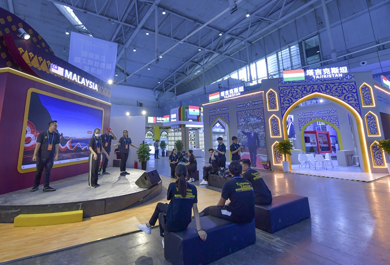 6月25日,马来西亚参展商在展位排练文艺演出。新华社记者 王菲 摄