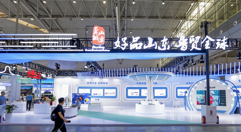 6月25日,工作人员经过主宾省山东展台。新华社记者 陈朔 摄