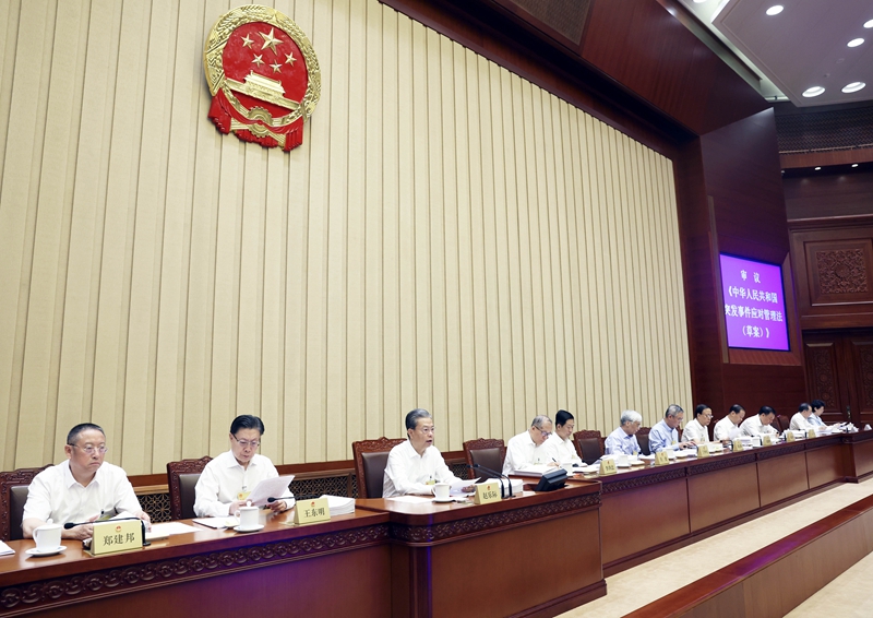 会议听取了全国人大宪法和法律委员会副主任委员黄明作的关于突发事件应对管理法草案审议结果的报告。草案三审稿继续使用“突发事件应对法”的现行法律名称;加强应急宣传和演练的针对性,提高公众参与度;进一步发挥科技在突发事件应对工作中的作用;完善关于确定突发事件应急响应级别的规定;完善突发事件应对中责任追究的规定,鼓励干部在临机处置时勇于担当作为等。