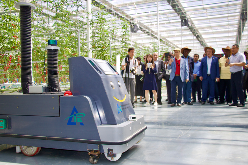 鄂尔多斯市达拉特旗德农现代高效设施农业产业园13000平米的大棚内,全自动机器人在无土栽培的西红柿藤蔓间往来穿梭,高效完成巡检、采摘、施肥等各项工作。使节们边看边赞叹不已。