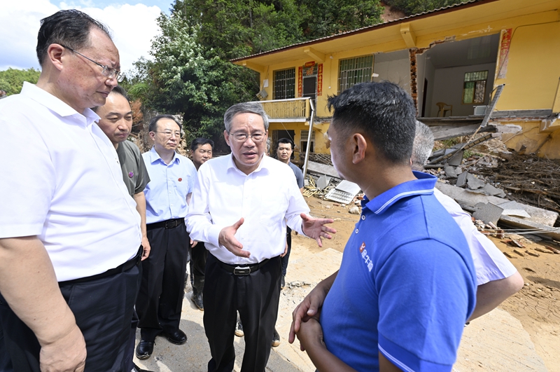 8月1日,中共中央政治局常委、国务院总理李强在湖南郴州看望慰问受灾群众,检查指导防汛工作。这是李强在资兴市州门司镇燕窝村实地察看灾情,走访受灾村民。新华社记者 岳月伟 摄