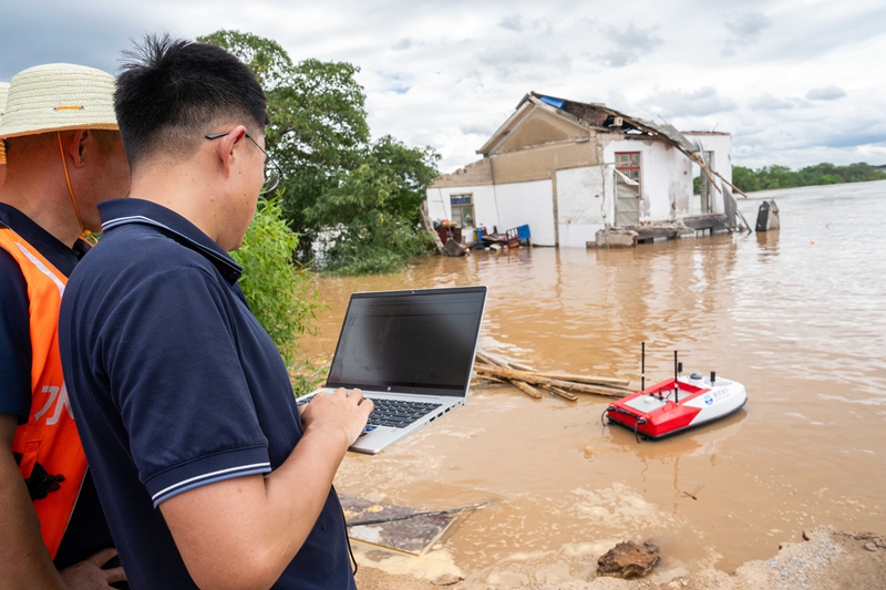 7月29日,在湖南省湘潭县易俗河镇四新堤决口现场,水利部门工作人员测量决口附近的水深、流速等信息。新华社记者 陈思汗 摄