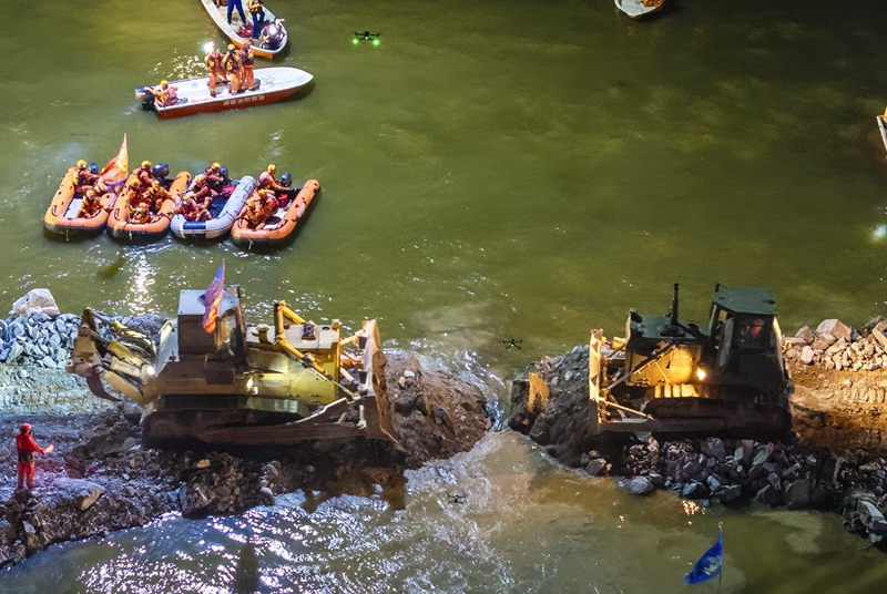 这是7月8日晚拍摄的团洲垸洞庭湖大堤决口封堵现场(无人机照片)。8日22时31分,团洲垸洞庭湖大堤决口完成封堵。新华社记者 陈思汗 摄