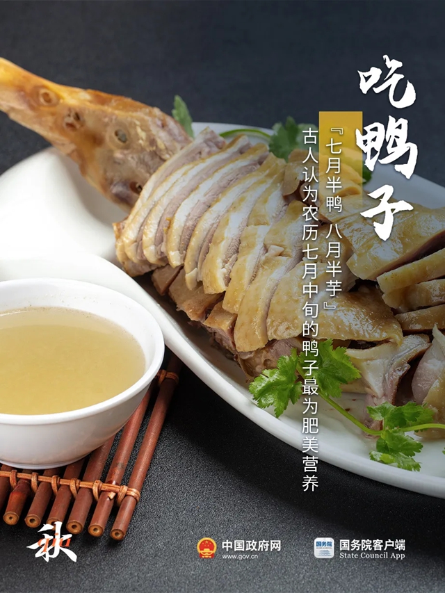 “七月半鸭,八月半芋”,古人认为农历七月中旬的鸭子最为肥美营养。