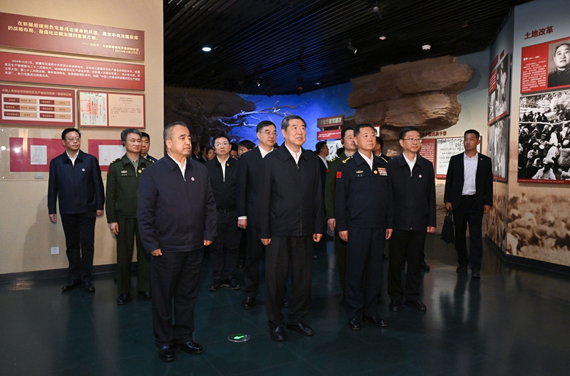 10月7日,中共中央政治局委员、国务院副总理、中央代表团团长何立峰率中央代表团来到新疆生产建设兵团八师石河子市慰问调研。这是何立峰率中央代表团来到新疆兵团军垦博物馆,听取兵团屯垦戍边的革命历史,详细了解兵团人在推动新疆发展、增进民族团结、维护社会稳定、巩固国家边防等方面作出的重要贡献。新华社记者 李响 摄