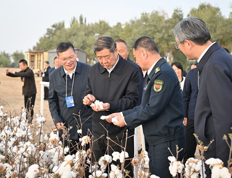 10月8日,中共中央政治局委员、国务院副总理、中央代表团团长何立峰率中央代表团来到新疆生产建设兵团九师白杨市和一师阿拉尔市慰问调研。这是何立峰率中央代表团在一师阿拉尔市10团18连机采棉作业现场,调研兵团现代化农业生产及农业机械装备制造情况,观摩机采棉现场作业。新华社记者 李响 摄