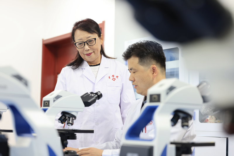 2023年10月26日,崔丽在辅导青年教师观察组织切片标本。新华社发(方卫东 摄)
