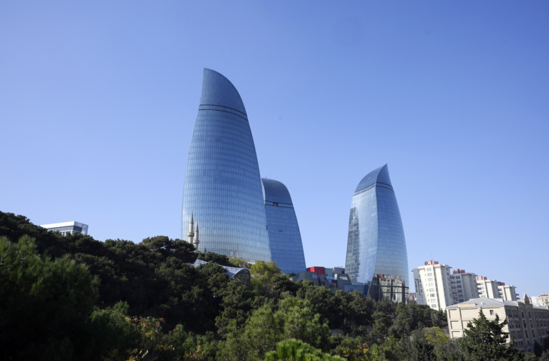 这是11月1日拍摄的阿塞拜疆巴库地标建筑之一——“火焰塔”。新华社发(托菲克·巴巴耶夫 摄)