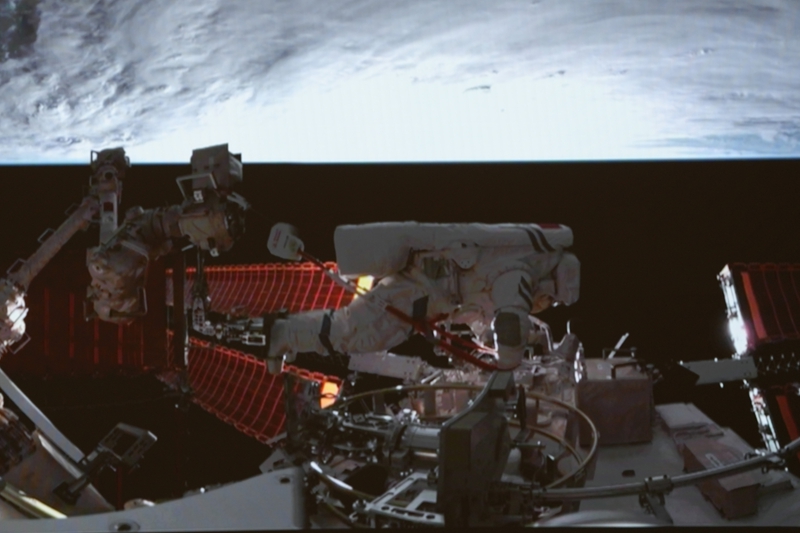 1月20日在北京航天飞行控制中心拍摄的神舟十九号航天员宋令东在空间站组合体舱外工作的画面。新华社记者 刘芳 摄