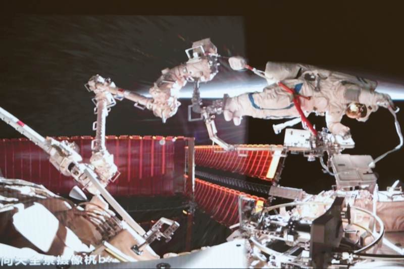 1月20日在北京航天飞行控制中心拍摄的神舟十九号航天员蔡旭哲(右)、宋令东(左)在空间站组合体舱外工作的画面。新华社记者 刘芳 摄