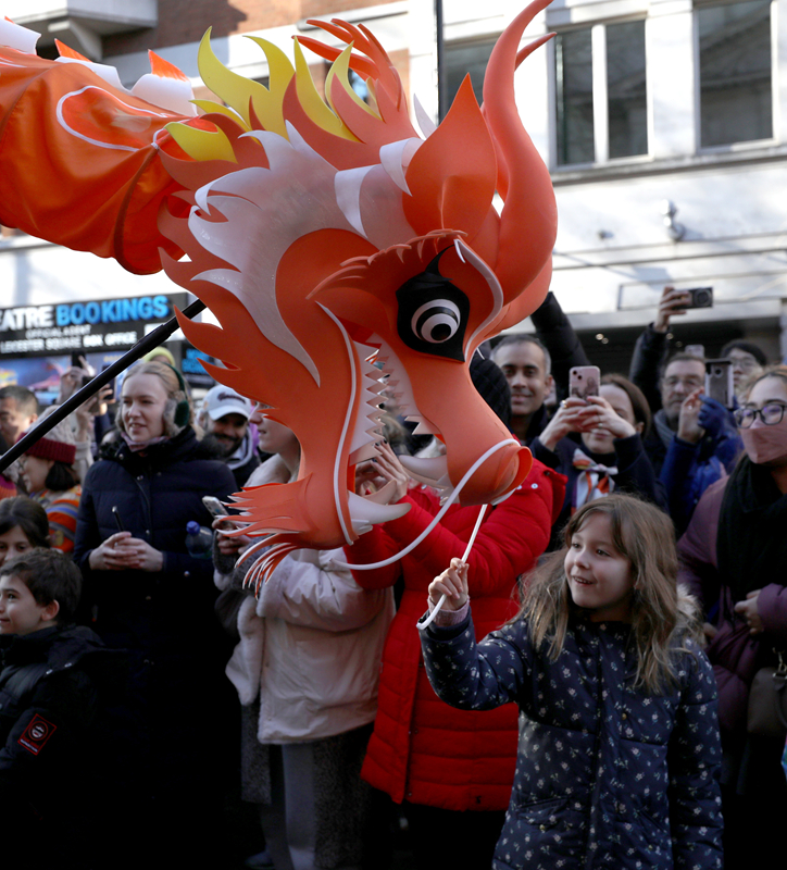 2025年2月2日,一名女孩在英国伦敦举行的新春巡游活动上与“中国龙”互动。新华社记者 李颖 摄