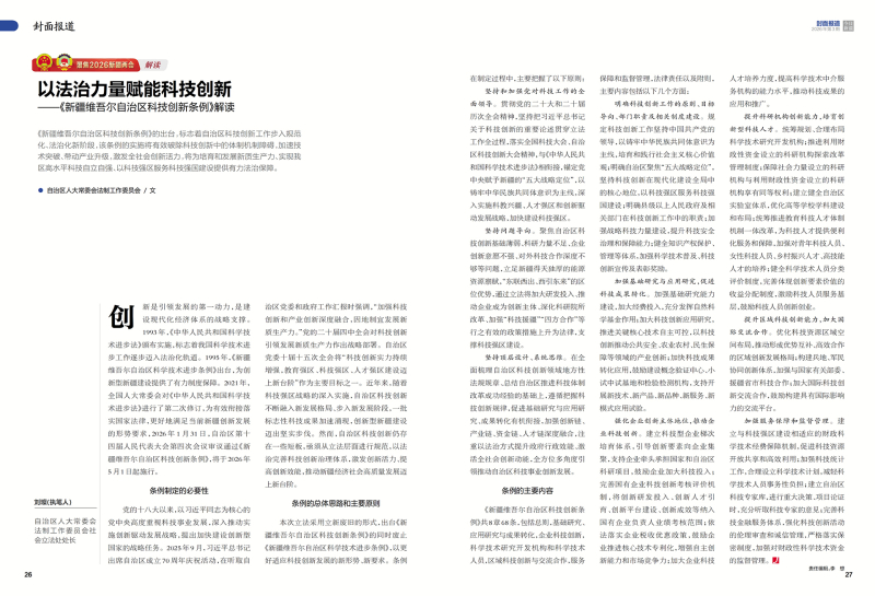 创新是引领发展的第一动力,是建设现代化经济体系的战略支撑。1993年,《中华人民共和国科学技术进步法》颁布实施,标志着我国科学技术进步工作逐步迈入法治化轨道。1995年,《新疆维吾尔自治区科学技术进步条例》出台,为创新型新疆建设提供了有力制度保障。2021年,全国人大常委会对《中华人民共和国科学技术进步法》进行了第二次修订,为有效衔接落实国家法律,更好地满足当前新疆创新发展的形势要求,2026年1月31日,自治区第十四届人民代表大会第四次会议审议通过《新疆维吾尔自治区科技创新条例》,将于2026年5月1日起施行。