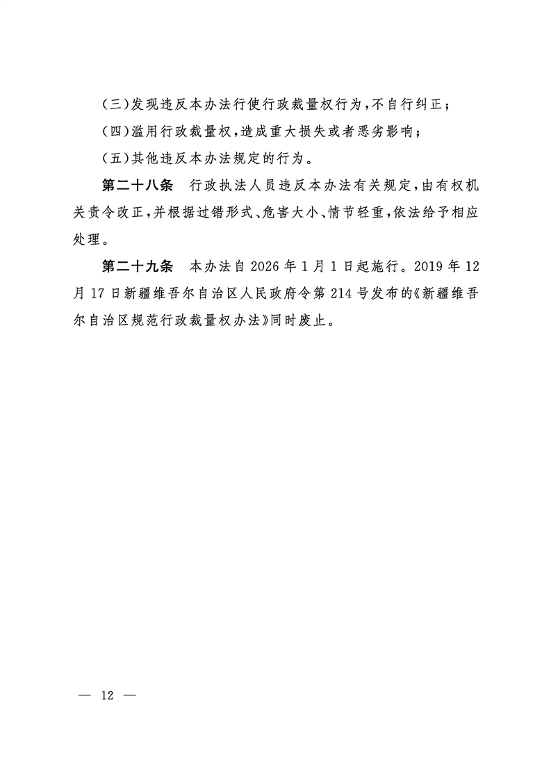 《新疆维吾尔自治区行政裁量权基准制定和管理办法》已经2025年10月10日自治区第十四届人民政府第123次常务会议通过,现予公布,自2026年1月1日起施行。